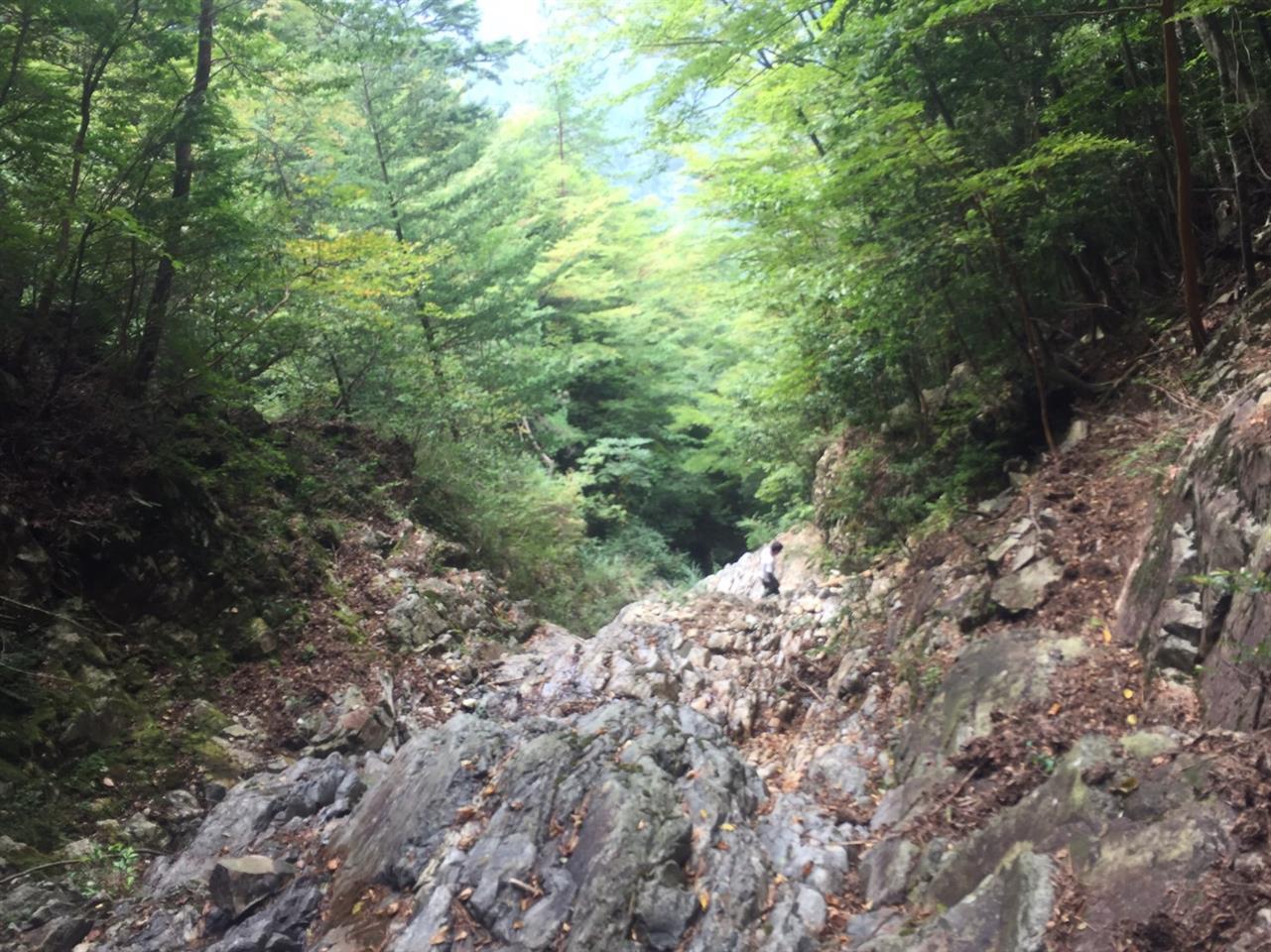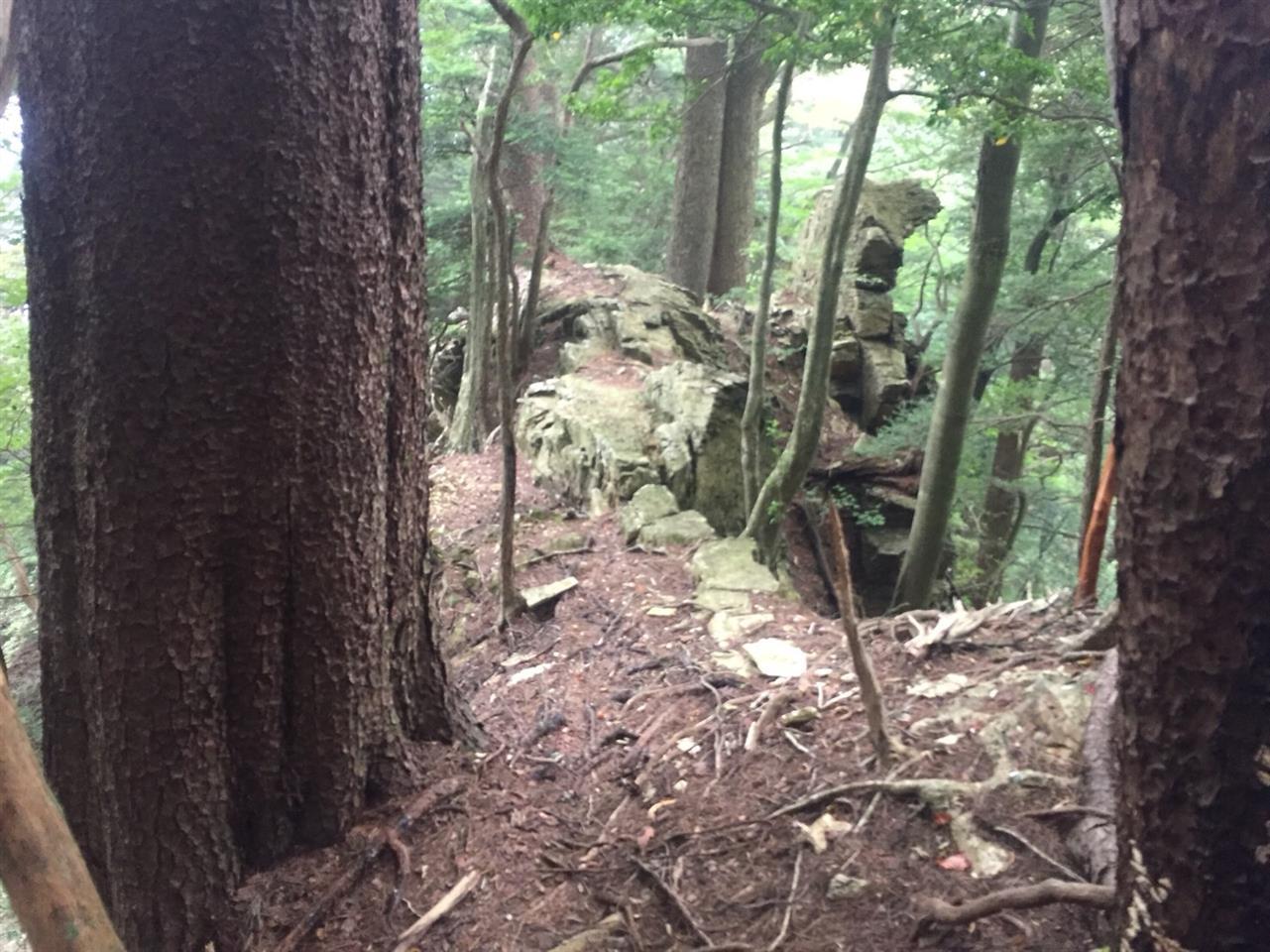 子供心に火がついたオッサン2人。すでに2時間程度周囲を捜索した後だったので、このジャリ道を進んで行くには時間がかかりすぎるので、この見た感じやったら30分位の近さやない?とか言いながら、オッサンはオッサンの説得を試みます。自分は普段から狩猟で獣道を散策したり、えげるない道を通る事が多いという経験を持って、スパイク足袋を履いて登る事に条件が良かったので、負けず嫌いな一面をつついて、直登するという無謀な決断を勝ち取りました。どうやら方角とGPSの距離関係から推測すると、有名な山頂あたりだろうと目測し、帰りは登山道をゆっくり帰れば良いという考察結果が決断を後押ししました。2人いればもし滑落しても助けを呼べるのと、相方は高度計と方位磁石がついた腕時計を装備していました。現在の高度は635m、頂上は1000m付近とか言っており、アタック開始!猪や鹿の足跡のような痕跡が随所に見られ、遭遇するかもしれないというスリルと、手足4本使わないと登れない程の急坂。気持ちはどんどん野生化していきます。赤松があれば足元を確認し、嗅覚を研ぎ澄ませながら登っていきます。30分で800m程の高度の所まで来ました。さすがの急坂で乳酸が溜まって休憩しないとキツイです。これはこの道帰るのは無理や!とか言いながら、負けず嫌いなオッサンはまだ半分くらいなのでお互い競争するように方位を確認しながら登って行きました。1時間くらい登って1000m辺りの所に来ました。ずっと木で視界が遮られる山道だったのですが、やっと空が見えて見晴らしの良い、ちょうど見上げた山のデベソみたいな所のふもとに近づいたイメージでした。携帯の電波を確認するとアンテナが1~2本入ったので、GPSを確認。驚愕の事実が明らかになります。有名な山の山頂はここから直線で600m、山頂は1600mくらいありました…。目指していたデベソは無名な山の一角。もちろん登山道なんて存在しません。ちょうどヘリコプターが飛んでいたので、半分本気、半分冗談で「乗せてくれ~!」とか叫んでいました。やまのデベソは近そうだったので、どうせなら山頂を拝んでやろうと登って行くと、最後には左右は断崖絶壁で目の前は垂直な岩壁となったので断念しました…。来た道を戻る以外に道はありません。心がポッキリ折れたオッサン2人はこうやって遭難者が出るんやろうな…。とか言いながら下山開始。登山中はあれだけ来た道を下山するのは嫌でしたが、やはり下り始めたら早かった。登りは1時間半ぐらいだったのですが、下りは1時間弱。車まで戻った時にはヒザが大笑いしてました。結局、な~~~んの収穫もなし。ちょっとしたスリルを味わっただけですが、そのスリルは同じ日常を繰り返すオッサンの心を満たすには充分でした。オッサンとはまた行こう!と約束をして、それぞれお互いの日常に戻って行きました。
